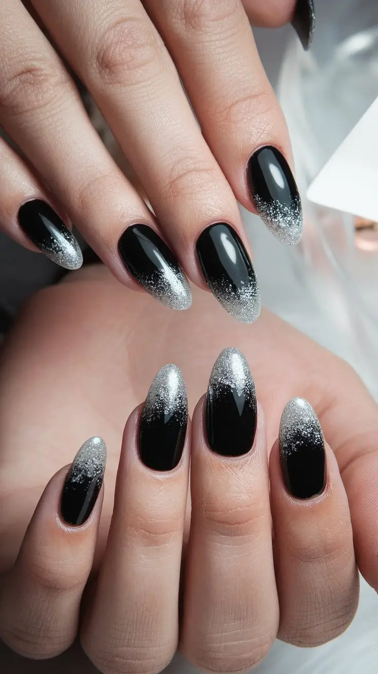 A black ombre with glitter gradient is a stunning nail design. It mixes black’s elegance with glitter’s glamour. This look is ideal for adding sophistication to your nail art.