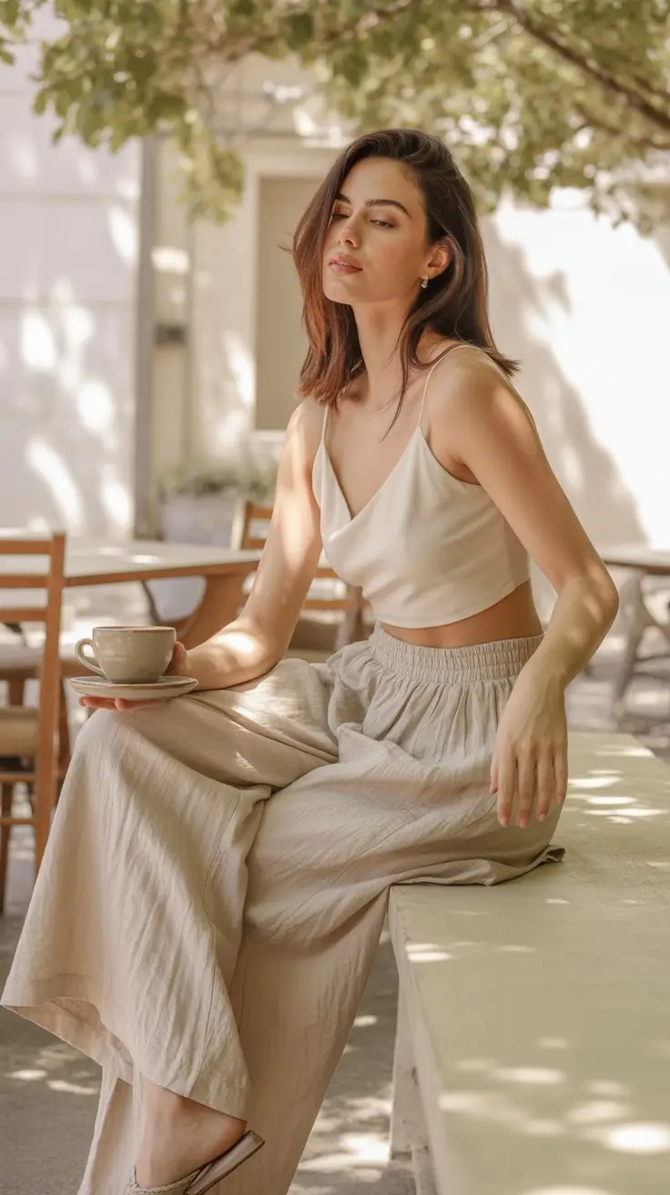 Linen pants paired with a cropped camisole make for a comfortable and stylish outfit. Ideal for a warm spring day.