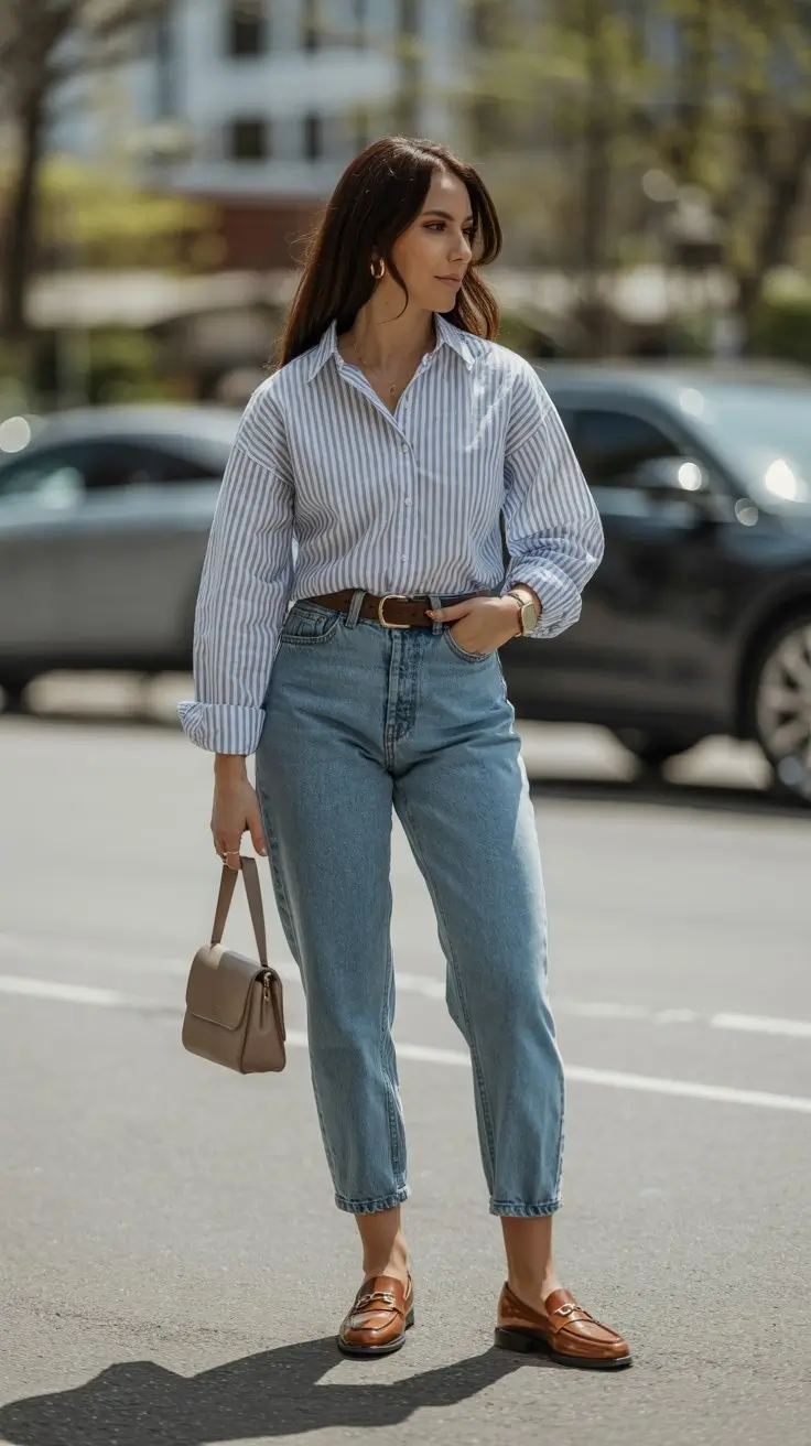 A striped button-down shirt with high-waisted jeans is a classic casual combination. Perfect for a day out or a casual lunch.