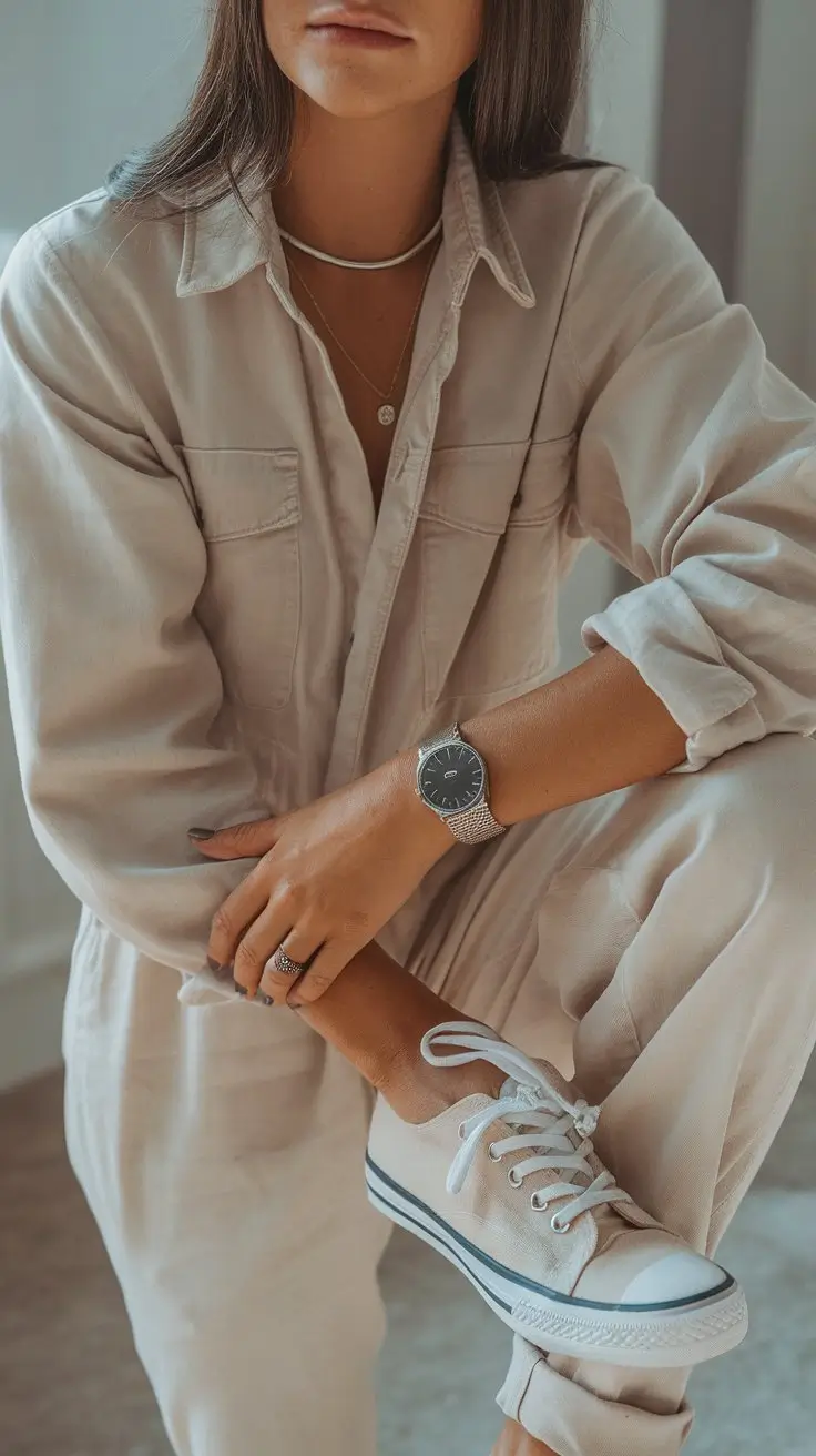 A cotton jumpsuit paired with canvas sneakers is a comfortable and stylish choice. Great for a casual day out or a relaxed evening.