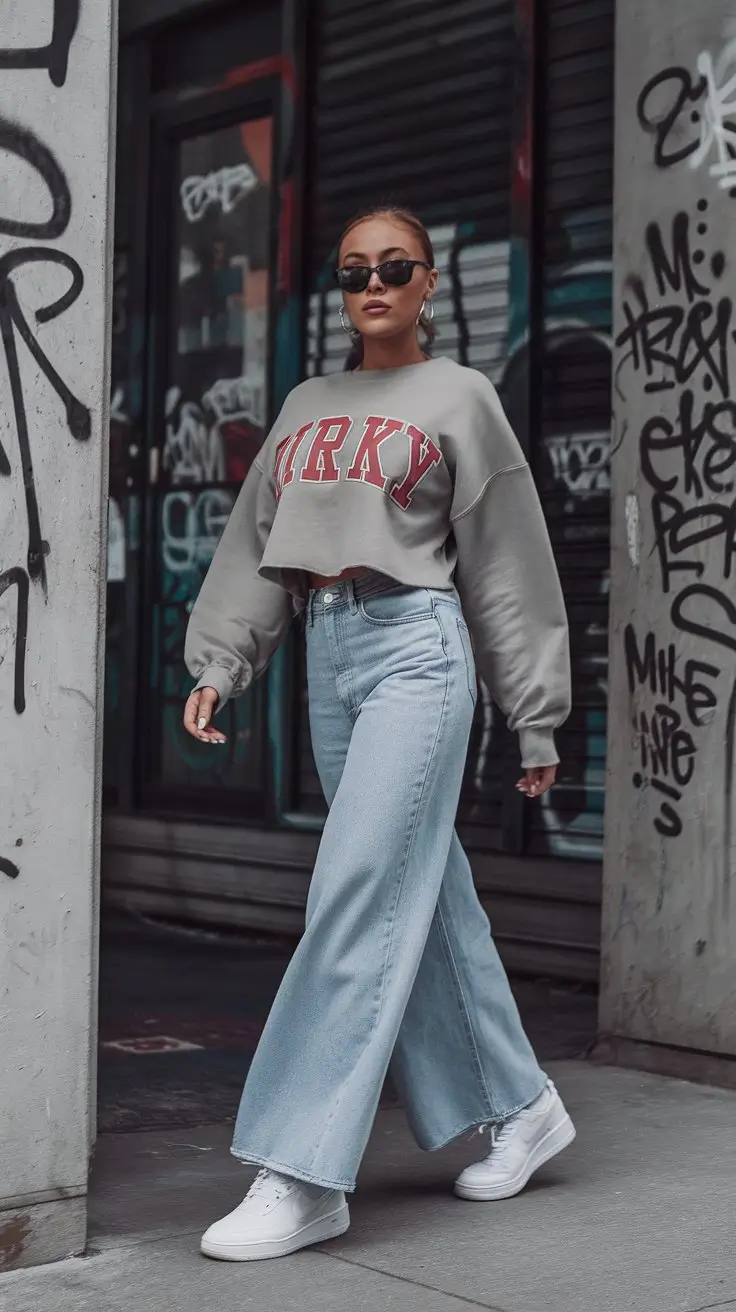 A cropped sweatshirt with wide-leg denim is a trendy and comfortable combination. Perfect for a casual day out.