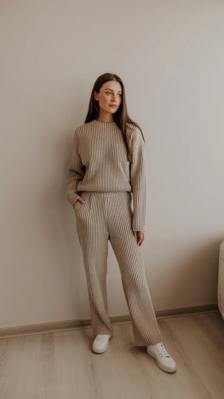 A matching knit set with straight-leg trousers offers a cozy and chic look. Ideal for a relaxed day out or a casual office setting.