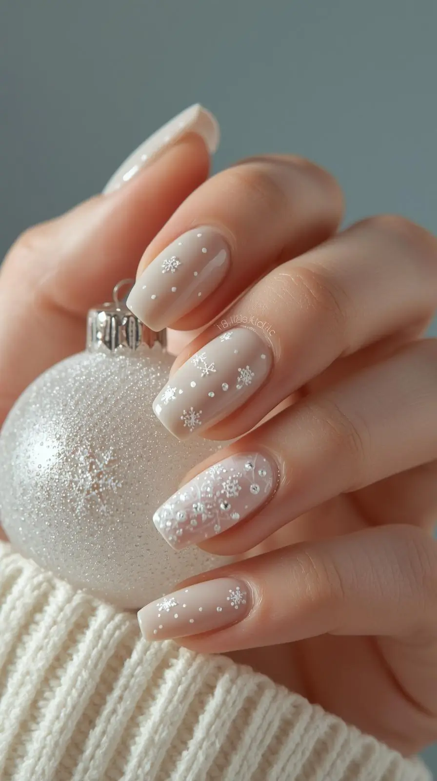 Add a touch of winter wonder to your holiday look with minimalist snowflake accents on your nails. This delicate design is perfect for those who prefer a subtle yet festive nail art look during the Christmas season.