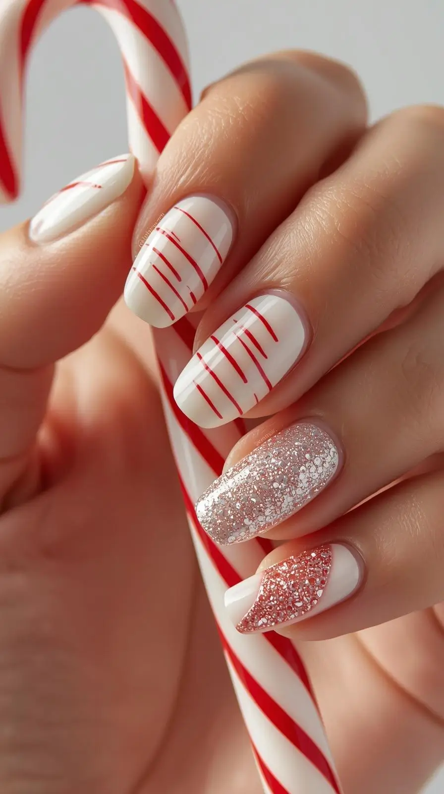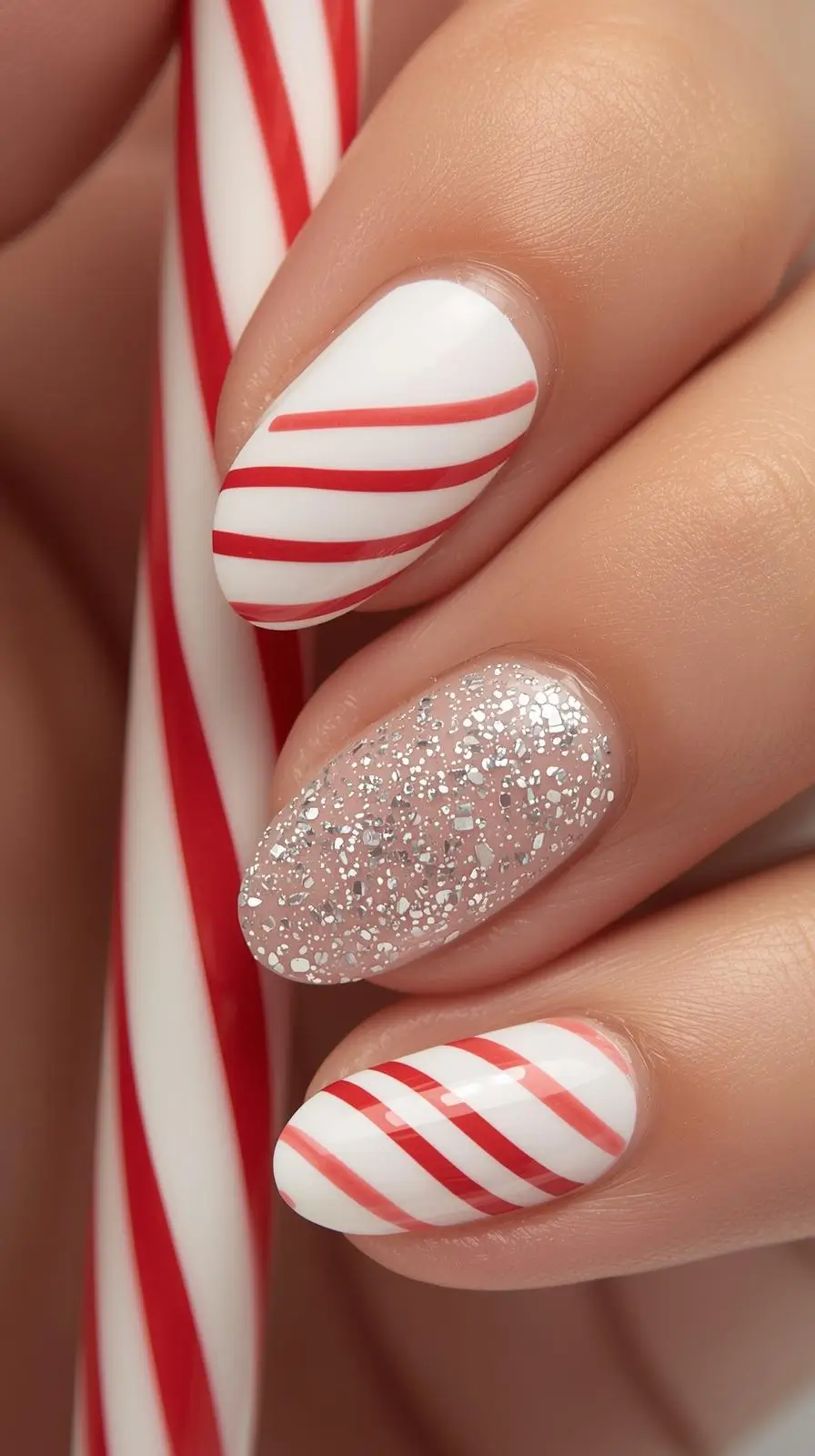Subtle candy cane stripes look great on almond and oval nails. These shapes let the stripes be the main focus.