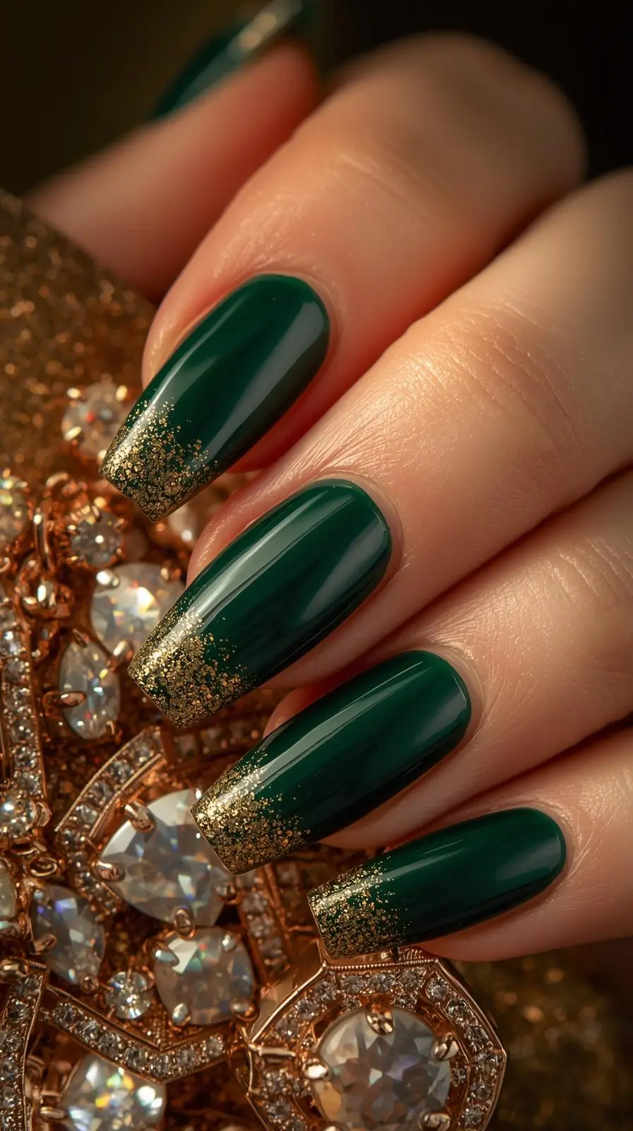 Now, add glitter to your emerald base. Choose a subtle glitter polish in gold or silver. Apply it thinly, focusing on the tips for a French look or all over for drama.