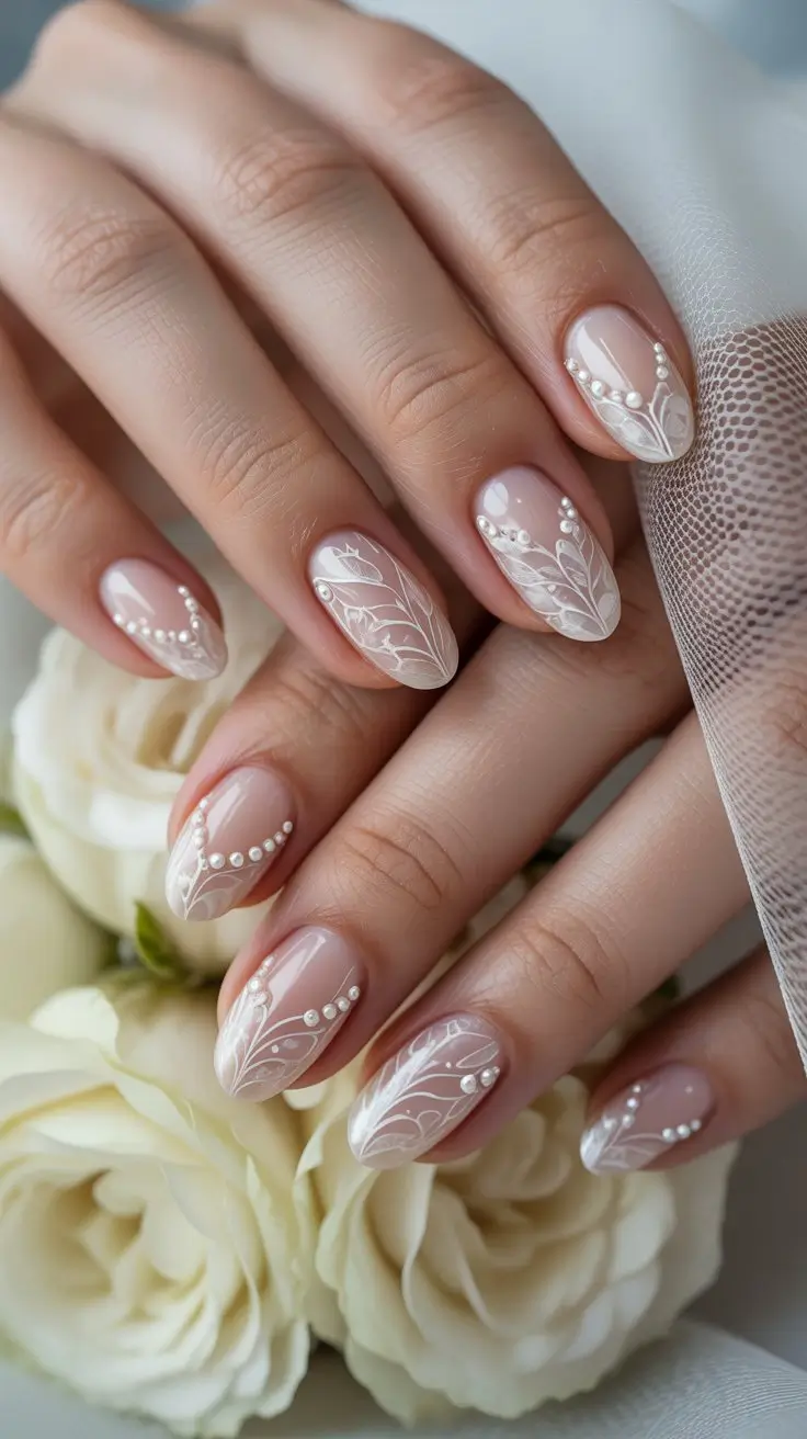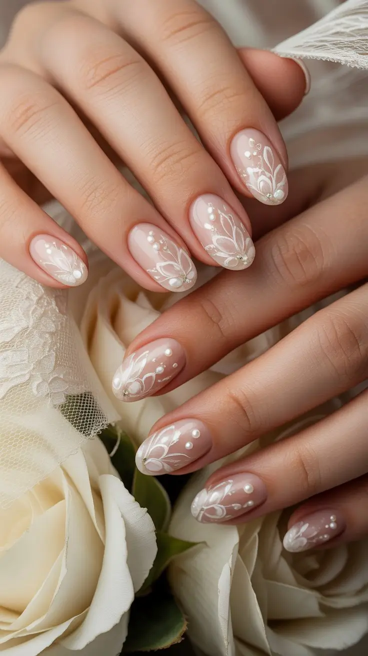Delicate Lace and Floral Patterns for Classy Engagement Nails