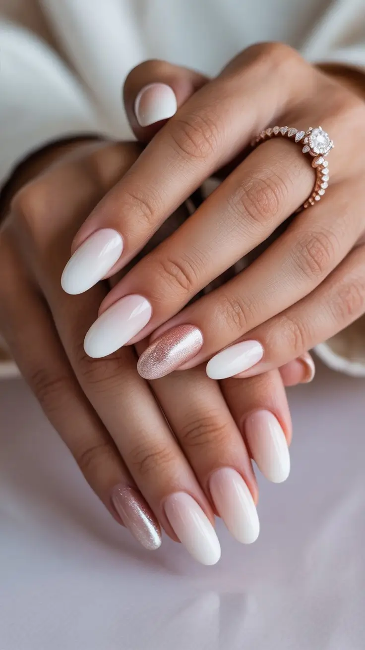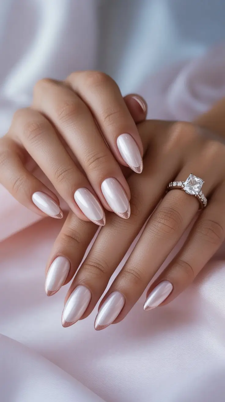 Rose gold is a popular choice for engagement nails due to its warm, romantic hue. It pairs beautifully with soft pinks and blush tones, creating a feminine and elegant look.