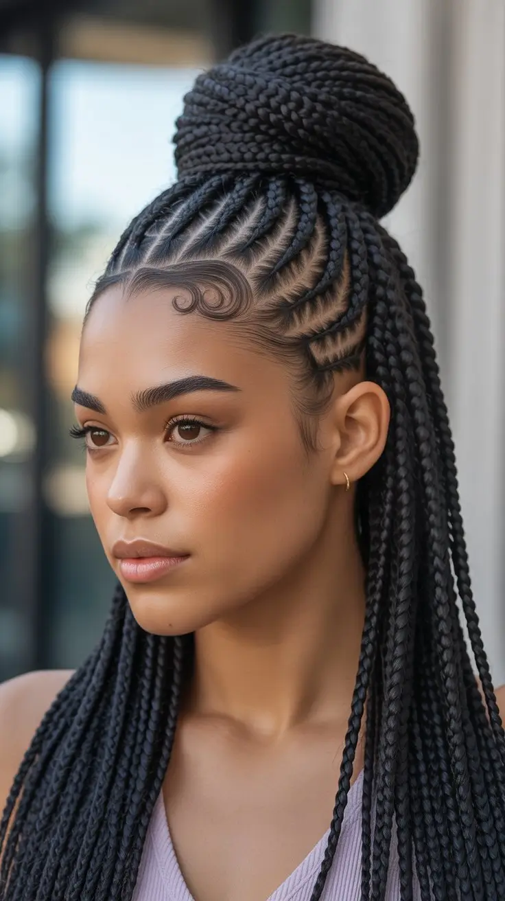 Elevate your style with cornrow hairstyles in a high bun. This look combines elegance with protective styling. It’s perfect for any occasion, from casual daily wear to formal events.