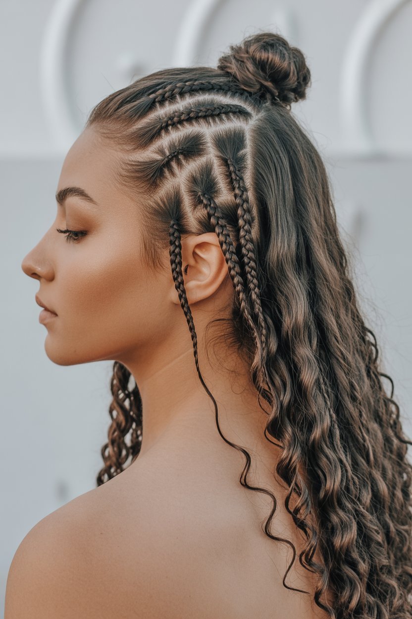 Combining cornrows with a half-up half-down style creates a unique look. It’s becoming more popular. This style offers both the protective benefits of cornrows and the elegance of loose hair. It’s perfect for any occasion, whether you’re dressing up or down.