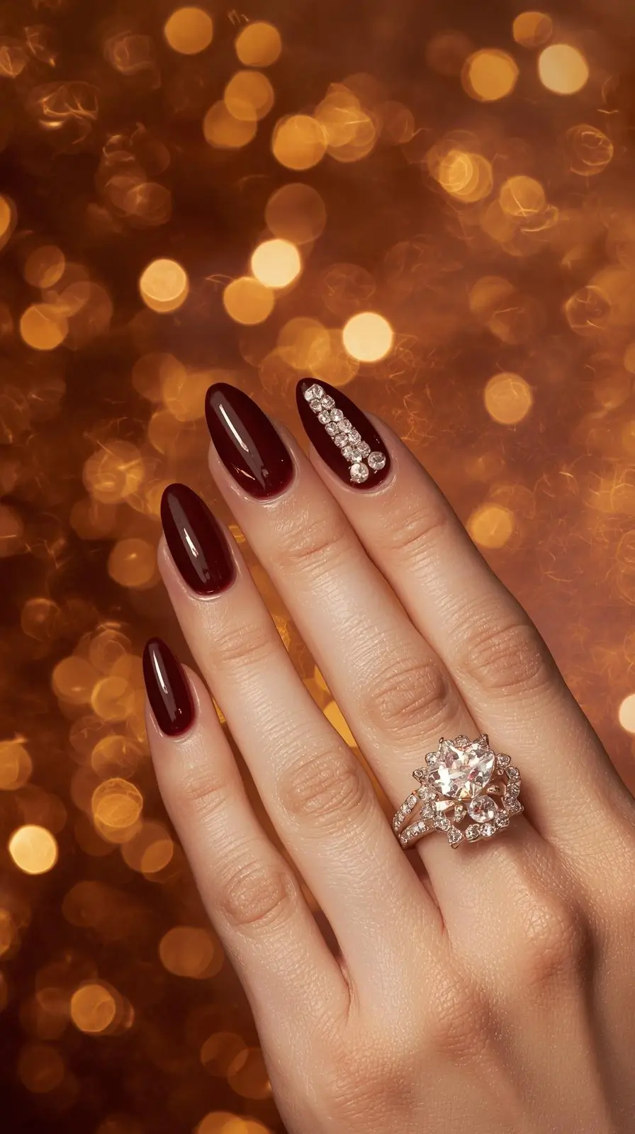 Accessories can really make your outfit stand out. With dark cherry red nails, metallic accents like gold or silver add elegance. Try pairing your nails with a bold cocktail ring or a delicate necklace.