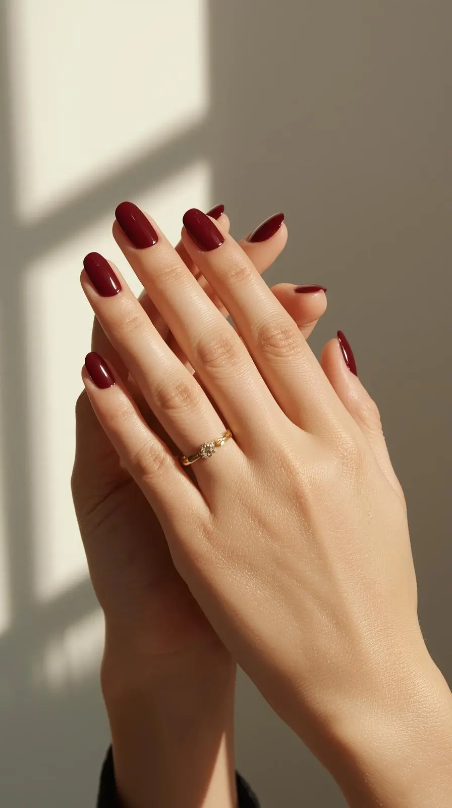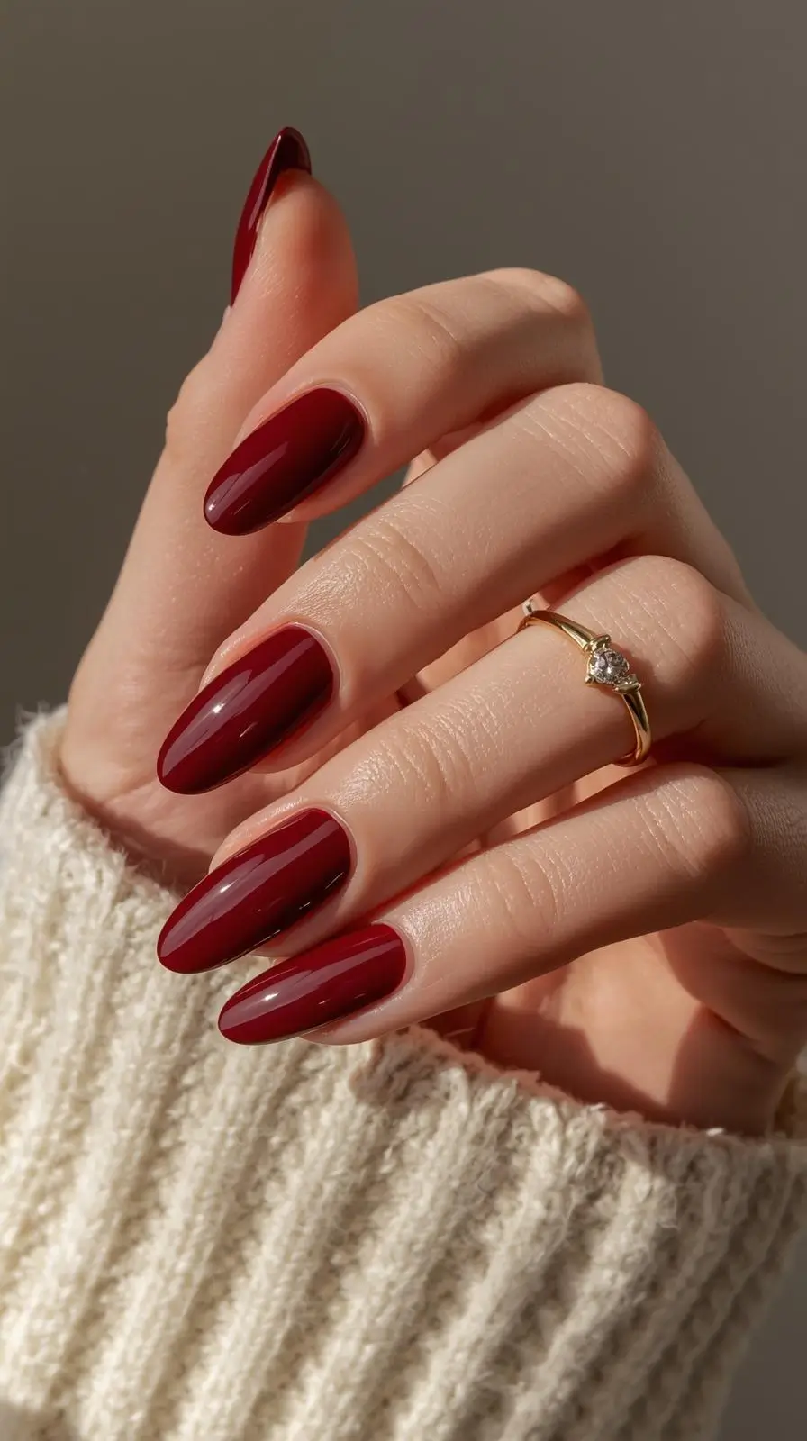 Dark cherry red nails work for every season, but the styling changes. For fall and winter, match them with warm tones and cozy textures. In spring and summer, go for lighter colors and brighter accessories.