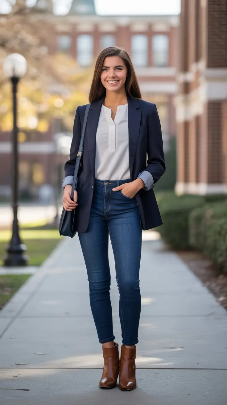 Pair a blazer with a crisp white shirt, a pleated skirt, or stylish trousers. Adding a bold necklace or patterned scarf can make your outfit pop.