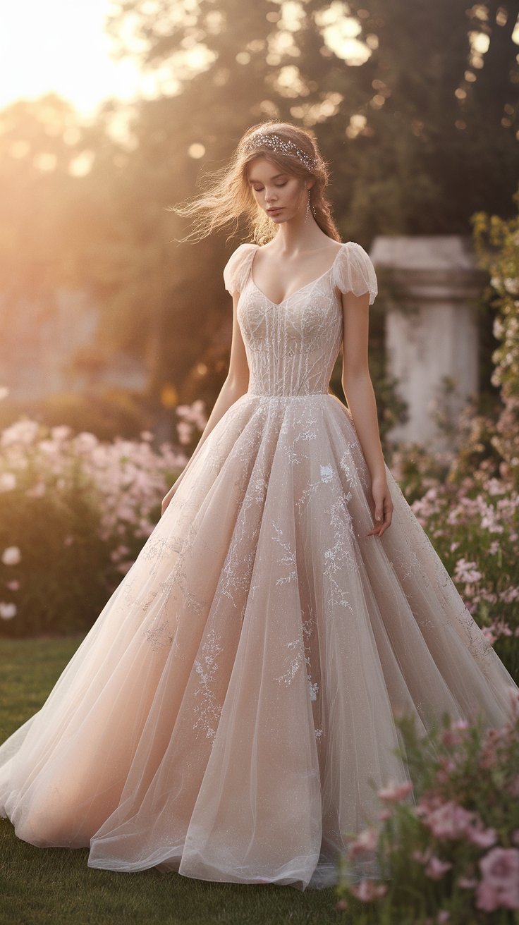 Delicate lace adds to the dress’s ethereal charm. Its detailed designs bring a touch of whimsy and romance. Soft colors like ivory, champagne, and blush also help create this magical feel.