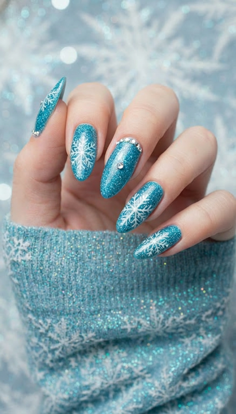 Popular designs include snowflakes, frosted French tips, and glittering ice queen looks. Winter wonderland landscapes and minimalist snowfall designs are also favorites. Try sweater weather nails and holographic ice shards too.