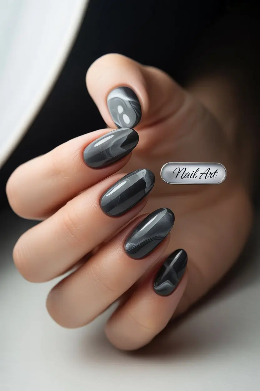 For matte black marble nails, use a thin brush to mix black, white, and silver polish. Soften the lines with matte top coat for a realistic marble effect.