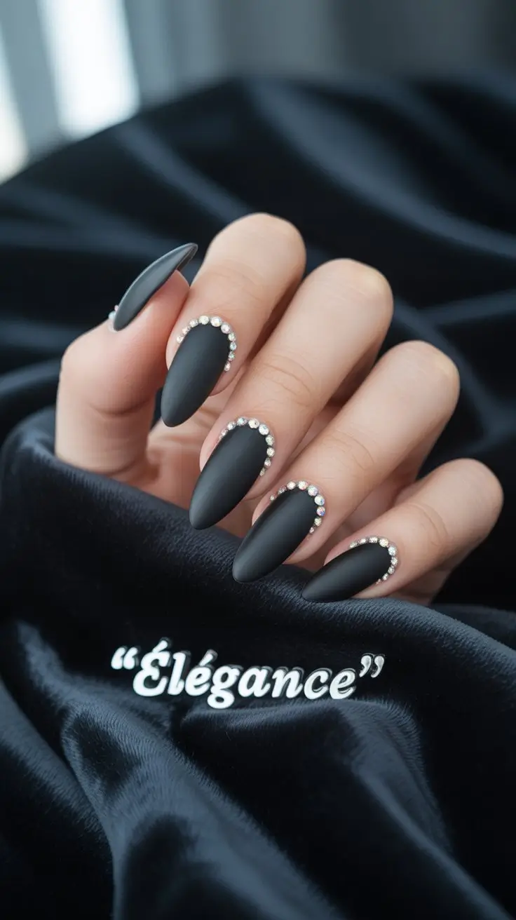 • 6. Matte Black Nails with Rhinestones