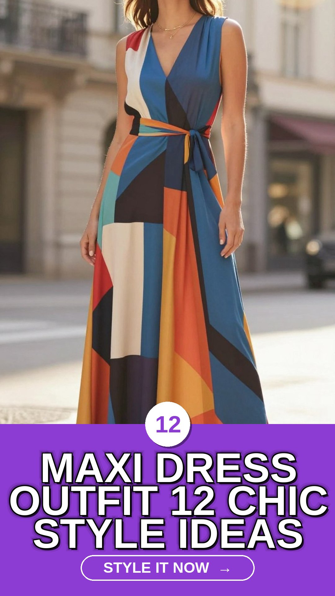 With a bold geometric maxi, keep accessories simple. Opt for neutral pieces like a nude sandal and dainty earrings. This lets the dress be the focus without looking too busy.