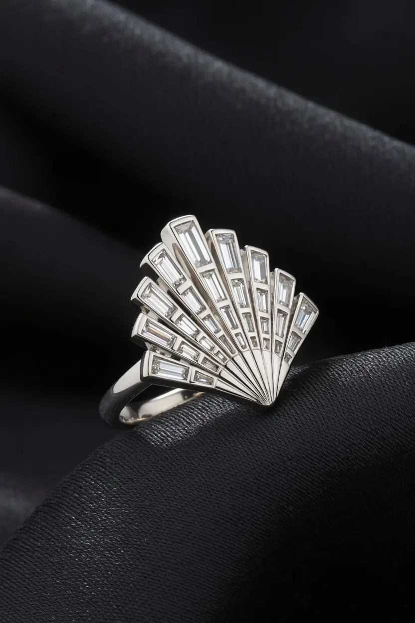 Think geometric lines, mirror symmetry, and stepped metalwork. A fan shape with baguette rays draws the eye without a big center stone. It is strong yet refined.